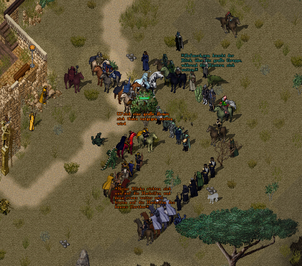 Spritzende Säure, mahlende Beißwerkzeuge, das Kratzen von unzählbar vielen Beinen im Staub der trockenen Steppenlandschaft. Klirrende Schwerter, Hiebe von Äxten. Zischende Pfeile und Bolzen und die Entladungen von arkanen Zaubern. Dazu die Trommeln, Lauten, Geigen und all der andren Instrumente, die die Barden zur Motivation anstimmten. Ein chaotisches Hin und Her zwischen Angriff und Rückzug begann schon recht früh und die Gelassenheit vieler war schnell verschwunden. Früh schon löste sich die ordentliche Formation der Armee in einzelne Gruppen und ihre Geplänkel auf. Früh schon fielen die ersten, welche die Stärke der Bestien unterschätzt hatten, benommen in den Staub. Früh schon wichen der Anfangseuphorie verbissener Gesichter, welche um ihr Überleben kämpften. Auch Aanatus, der sich lange hinter Elnora halten konnte, fand sich bald weit weg seiner Truppe aus Bundhandwerkern in einem Scharmützel wieder. Weit und breit kein minzfarbiger Umhang des Bundes mehr zu sehen. Einen Elfen konnte er ausmachen und diese Amazone, die ihn damals in Nebelhafen wegen seiner Zeichnung zur Rede stellte. Auch ein Söldner und zwei andere menschliche Kämpfer waren an seiner Seite, als sie versuchten, eine riesige Ameisenkriegerin zur Strecke zu bringen. Kein Wort wurde gesprochen – man kämpfte sprichwörtlich ums Überleben. Irgendwann jedoch herrschte Stille. War das der Sieg? Mitnichten. Man stand erst vor den Mauern der Stadt, dessen Tor durch Felsbrocken verschlossen war. Die einzelnen Grüppchen formierten sich und man beriet, wie diese Barriere beseitigt werden konnte. Niriel bat den Handwerkerbund, die Aufgabe zu übernehmen. Aanatus, der damals in Nebelhafen bei der Trollbarriere keine Sprengungen vornehmen durfte, hatte leider keine Explosionstränke mit sich, auch fehlte es an Spitzhacken in den Reihen der Handwerksbündler. Doch man kratzte sich Werkzeug zusammen und nach schweißtreibenden Arbeiten war der Weg in die Stadt frei.