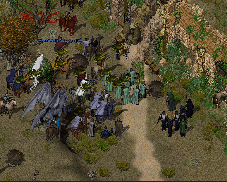Im Moment der Öffnung hörte man sogleich das alarmierte Kreischen der Ungetüme. Der schmale Durchgang war denkbar ungünstig für die große Armee und die VertreterInnen des Handwerksbund befanden sich schon früh auf einem kleinen Brückenkopf im Inneren der Stadt. Dort konnte die zahlenmäßige Überlegenheit gegen die Ameisen nicht ausgespielt werden, was zu einem erbitterten Kampf um jeden Meter führte. Schritt für Schritt kam man vorwärts, irgendwann befand man sich dann auf einer größeren Freifläche und der Rest der Armee konnte nachrücken. Doch dort stürmten von allen Seiten Drohnen und Kämpferinnen auf die Recken heran – und dann auch noch eine gigantische Königin! Wieder wandelte sich das Bild des Kampfgeschehens und durch die Topographie einer Stadt und seiner schmalen Wege, verlagerte sich das Kriegsgeschehen noch mehr in einzelne Gruppenkämpfe als vorher. Doch irgendwann mal herrschte wieder Ruhe und man sammelte sich an einem Altar, der in seltsamen Rauch gehüllt war. Plötzlich tauchte dort eine Gestalt auf…düster anzusehen…und verwickelte die Amazonen in ein Gespräch. Viel konnte Aanatus nicht hören, stand er doch weiter abseits Wache und zusätzlich dröhnten seine Ohren noch vom Kampfeslärm vorher. Dann ein Schattentitan. Sich selbst nur noch „ANGRIFF“ rufen hörend stürmte Aanatus mit dem Grüppchen, das mit ihm Wache stand, auf den letzten Gegner dieses Kampfes zu. Als das Ungetüm endlich fiel, schaut Aanatus erschöpft um sich, um seine KameradInnen vom Bund zu finden. Sein Gesicht schmutzig, in einer Mischung aus Blut und Staub. Müde sammelten sich die Handwerksbündler. War das der Beginn der neuen Amazonenstadt?