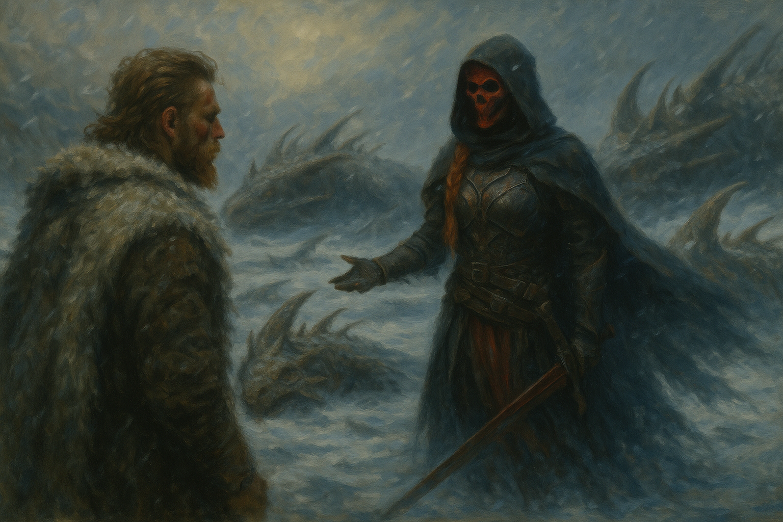 „Du bist müde, Bjornar,“ sang sie wieder. „Du hast so lange gearbeitet. Bau nicht weiter gegen den Wind. Ich kenne den kurzen Pfad. Da, sieh nur!” Sie wies mit ihrem knochigen Finger in die Schatten. Dort lag, als habe die Dämmerung selbst es hinein gezeichnet, sein Haus. Balken, Dach, Herd, alles richtig. Rauch stieg aus dem Schornstein, der noch nicht da war. Kinderlachen rollte aus der Tür, die nicht geöffnet wurde. Freyjas Stimme stand in der Luft wie eine Fackel, die niemals verlischt.
