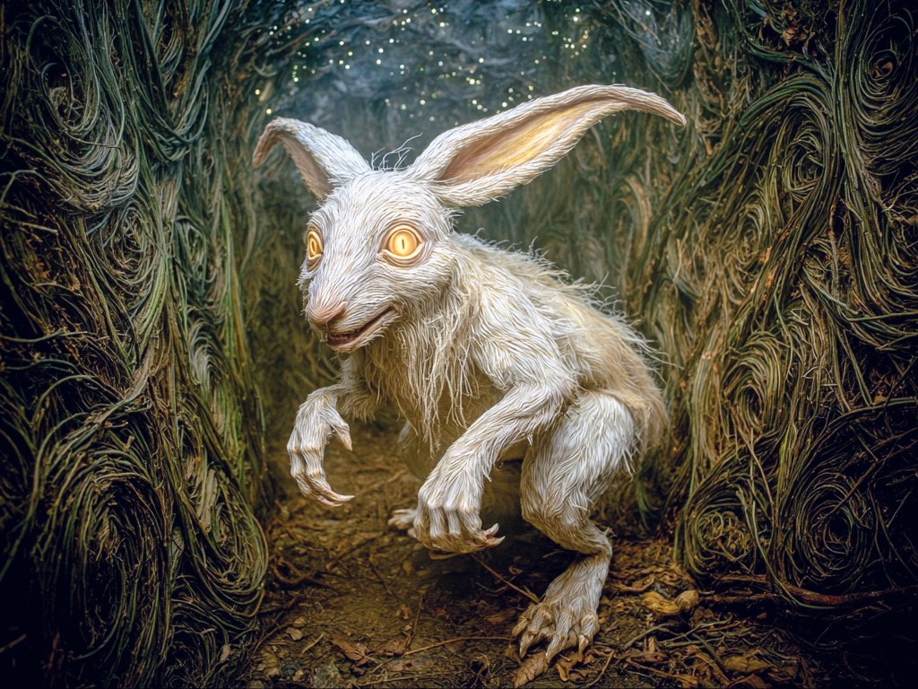 Er hob den Kopf. Der Hase saß da – weiß wie erster Schnee, die Augen feinst geritzt, als hätte jemand mit Nadellicht hineingeschrieben. Er war die Ruhe eines Tieres, das seinen sicheren Ort kennt und blickte Bjornar an. Er verweilte freiwillig. Die Ohren standen, als lauschten sie auf eine ferne Melodie.