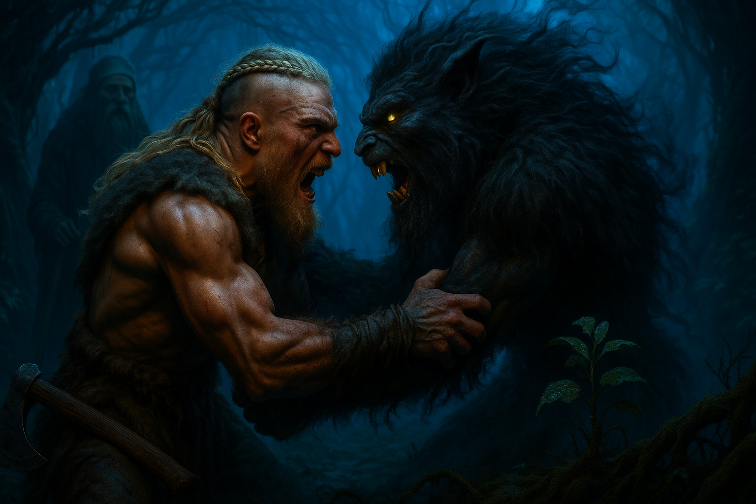Die Lichtung, die Bjornar nun schlafwandelnd aufnahm, war rund und dunkelblau. Der Himmel lag darüber wie ein Tuch, das jemand straff gezogen hatte; Sterne steckten schon darin, doch als feine Stiche, die erst später leuchten würden. In der Mitte stand eine Gestalt, die keine war und doch alles: er selbst, größer, zottiger, mit gelben Schmied-Augen, mit Runenblick. Von Angesicht zu Angesicht.