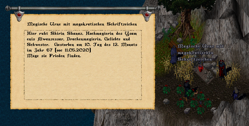 Das Wissen, dass Shirins Körper noch immer in Glaedi lag und das Ritual schon etwas länger her war – auch wenn die Zeit in Glaedi deutlich langsamer verstrich - liess mich unruhig werden und so lud ich alle Drei ein, sich in der Magieakademie einzufinden, von wo aus wir uns in Naurms Ebene begaben und den Leichnam bargen, um ihn an einen Ort zu führen, wo Shirin ihre letzte Ruhestätte finden würde. Hoch oben auf einem Plateau einer Gebirgskette, von wo aus man einen Grossteil der Landschaft der neuen Welt überblicken konnte. Ich wusste zufällig durch einen Ausflug, den wir wenige Wochenläufe vor der Falle dorthin unternahmen, dass es eines der Orte war, die etwas Besonderes für sie darstellten. Das war der Grund, warum ich ihnen diesen Platz vorschlug.