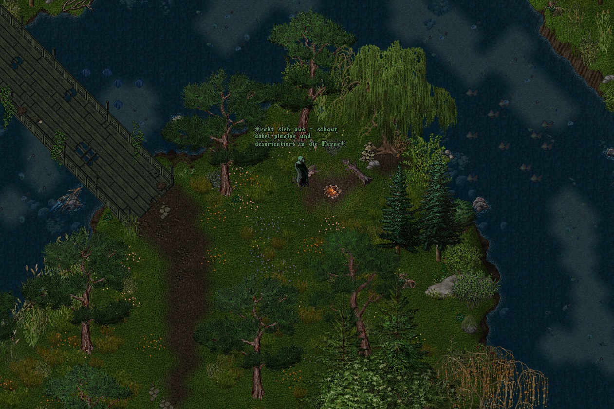 Am See angekommen nahm er zuallererst einen erneuten Nachtsichttrank. Bei seinem Vorhaben im Dunklen zu tappen, erschien ihm als sehr riskant. Aanatus' Pupillen weiteten sich sogleich. Er schaute sich um, rammte die Fackel in den Kriesboden nahe dem Ufer - sicher ist sicher - und verharrte nachdenklich für einen Moment.