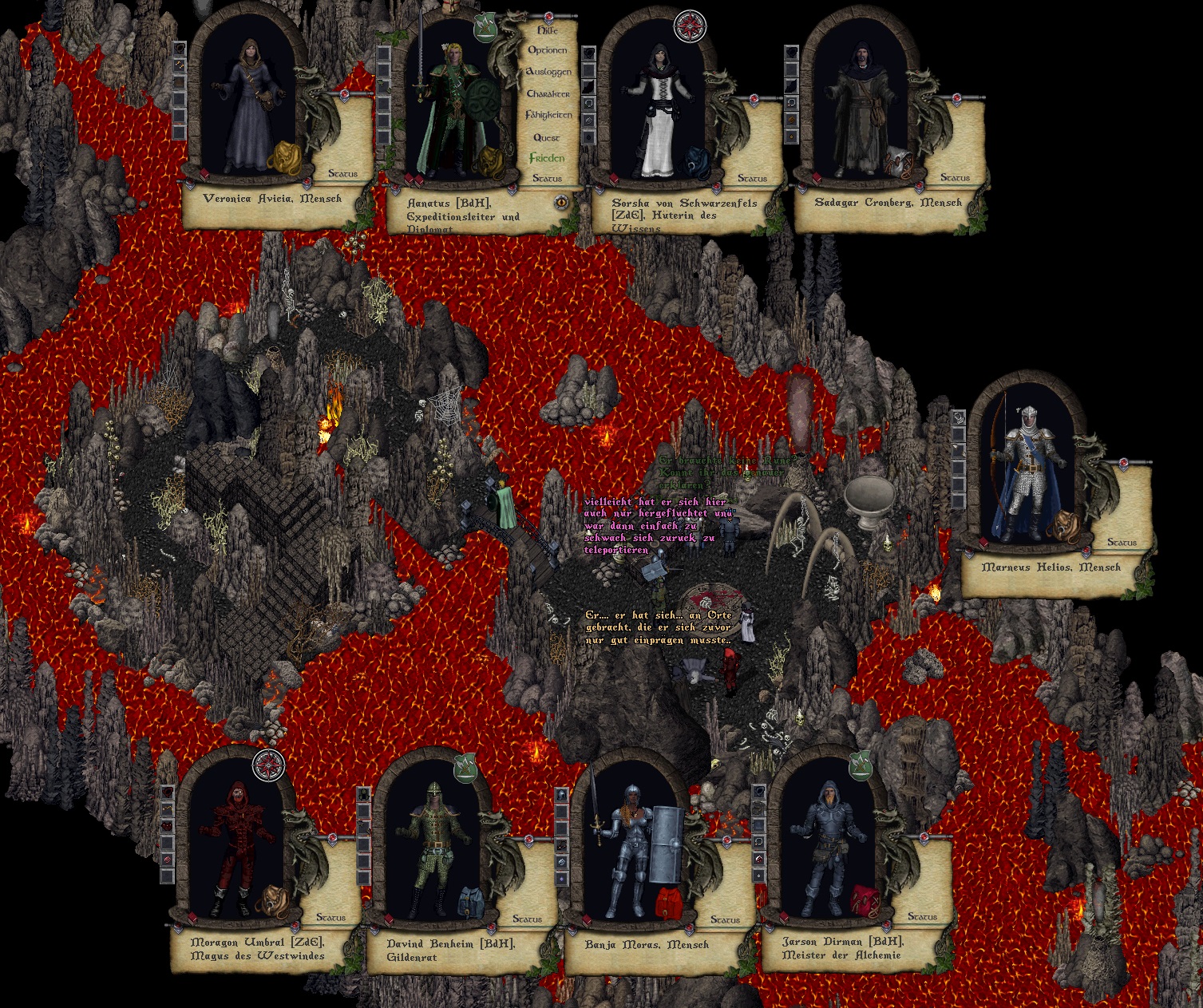 Als Rashka, Tarabasch und Davind ihre Wege gegangen waren, machte sich Aanatus in den sichtlich leergeräumten Drachenhöhlen auf, um seinem Versprechen an Veronica nachzukommen: Als er aus dem Dunkel der Höhle trat, dort wo die zornigen Drachen unter freiem Himmel hausten, blickte er kurz auf drei Kadaver eben derer, die vorhin erlegt wurden. Alles war sicher. Erst nachdem er sich ein zweites Mal prüfend umsah, entließ er seinen geschrumpften Hirtenhund Wulf und sah, wie dieser erstmals verwirrt umher sah. Asche, der Geruch von Lava, das kannte er noch nicht. Doch sein stoisches Gemüt schlug nach einer stürmischen, aber kurzen Begrüßung zu. Brav setzte er sich vor Aanatus und blickte fast fragend hoch. Der Gerüstete zog aus seinem Waffenrock den Lederschlauch des Meisters und ließ den Hund schnüffeln. „Such!“. Schon legte Wulf los. Kreise ziehend, vollkommen unbeeindruckt ob der für ihn neuen Umgebung, begann er Fährten aufzulesen. Aanatus folgte ihm in geringem Abstand. Dann schlug Wulf zweimal halblaut und freudig an. Wedelnd verharrte der Hund in der Nähe eines Felsens und als sein Besitzer sich neugierig näherte, offenbarte sich diesem ein kleiner Stofffetzen, in diesem unscheinbaren Dunkelgrau, welches auch Veronicas Robe schmückte. Etwas edlerer Stoff, bemerkte Aanatus, als er das Stückchen mit spitzen Fingern hochhob, kurz betrachtete, einpackte und danach den Hund mit Streicheleinheiten belohnte. Veronica sollte so schnell wie möglich einen Blick darauf werfen. Zurück nach Nebelhafen also.