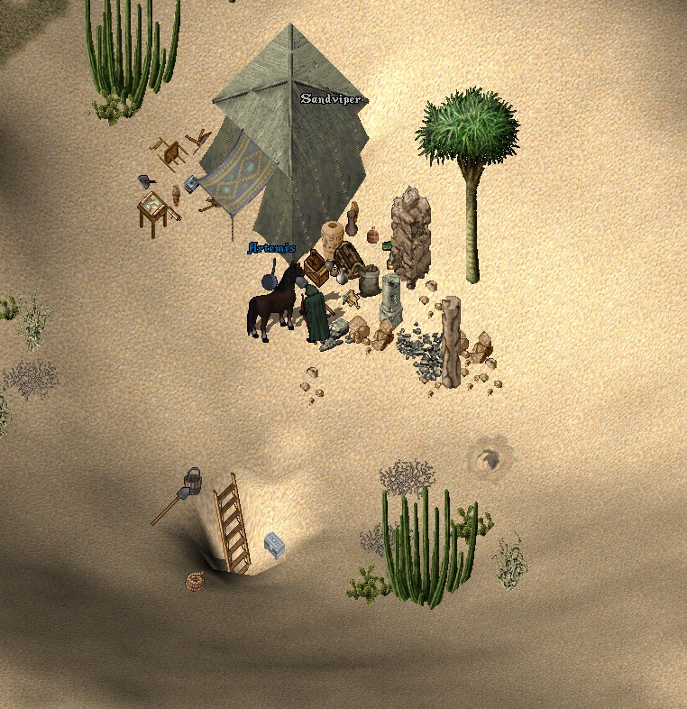 Ganz am „anderen Ende der Insel“, im Süden, schon ziemlich nahe an Solgard, war da noch das verlassene Lager in der Wüste. Auch das stand noch unverändert dort und brachte Erinnerungen an so einige Geschehnisse in diesen Gefilden mit sich: Hier hatten sich die Expedition mit dem meisten … „Konfliktpotential“ ereignet. Lehrreiche Momente. Er schmunzelte und strich sich unbewusst über den linken Unterarm.