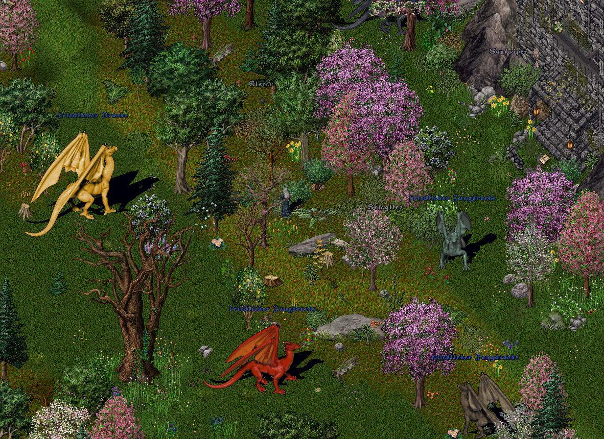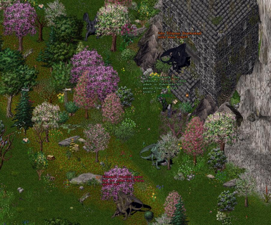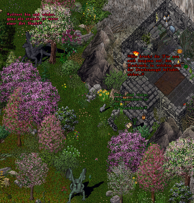 Dieses merkwürdige Gefühl war jedoch nur der Anfang, wie sich kurz darauf herausstellte. Inmitten der Nacht, während ich mich mit Shirin über die aktuellen Ereignisse unterhielt, hörte ich, wie die Erde vor dem Drachenturm bebte. Es waren eindeutig Schritte. Schwere Schritte. Nicht nur eines einzelnen Wesens, sondern gleich mehrerer. Ein Griff zu meinem Reagenzbeutel erfolgte, dann begaben wir uns gemeinsam hoch, um die Geräuschquelle auszumachen. Und siehe da, als Shirin die Tür öffnete, standen eine Hand voll Jungdrachen vor dem Turm! Bei den Altdrachen, dieser Anblick war sowohl verwirrend, als auch faszinierend! Das wirklich Ungewöhnliche daran war jedoch nicht, dass die Drachen in der Nähe des Turmes waren, das hätte durch die Nähe zur Grotte auch so passieren können – schätze ich – sondern vielmehr, dass sie friedlich waren. Sie schienen auf der Suche nach etwas zu sein, ihre Blicke fanden nämlich immer wieder zum Turm. Und schliesslich, als Shirin hinaustrat und dann auch noch ein weiterer Jungdrache dazu fand, wurde den beiden klar, dass der Drachen-Angol dafür verantwortlich war.