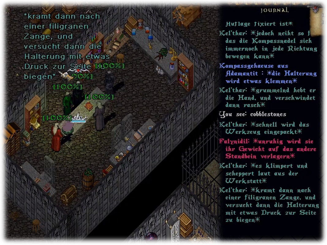 Der feuerverzauberte Dolch Kel’thars, den dieser der Ilharess kürzlich als sein Meisterstück präsentiert und dargeboten hatte, wurde schließlich verwendet, um die Runensymbole der Zauberformel auf die fertige Kompassnadel einzuarbeiten. Falynidil hatte diesen Vorgang in den Tagen zuvor hunderte Male an einem Dämonenknochen geübt, sodass es ihr nun gelang den Prozess ohne größere Probleme abzuschließen. Nachdem auch die Verzauberung der Kompassnadel vollzogen war, wurde Kel’Thar aus der Schmiede gerufen, damit die Nadel eingesetzt werden konnte. Das violette Gehäuse musste noch kurz angepasst werden, dann konnte die Nadel durch Kel‘thar eingesetzt werden.