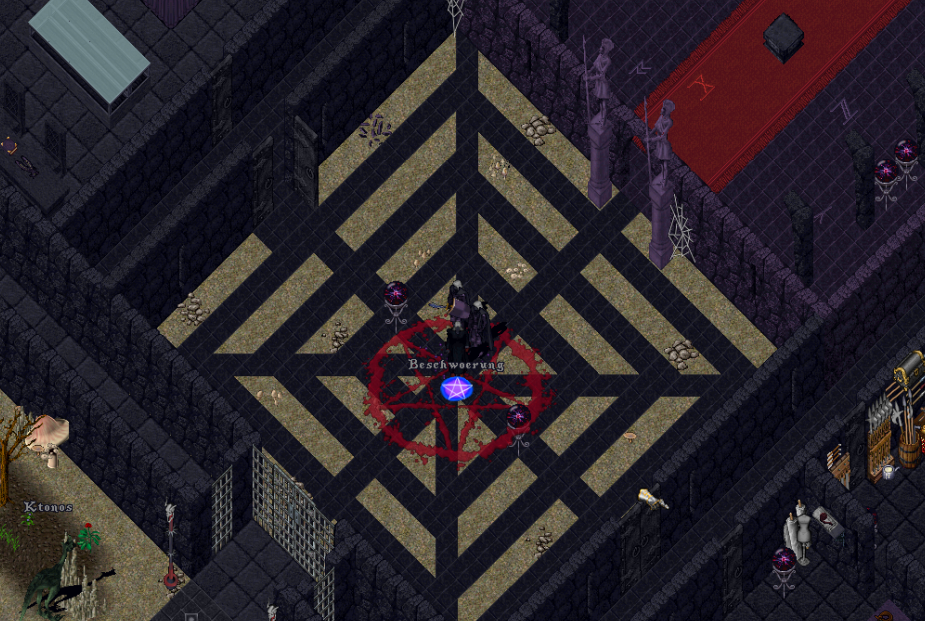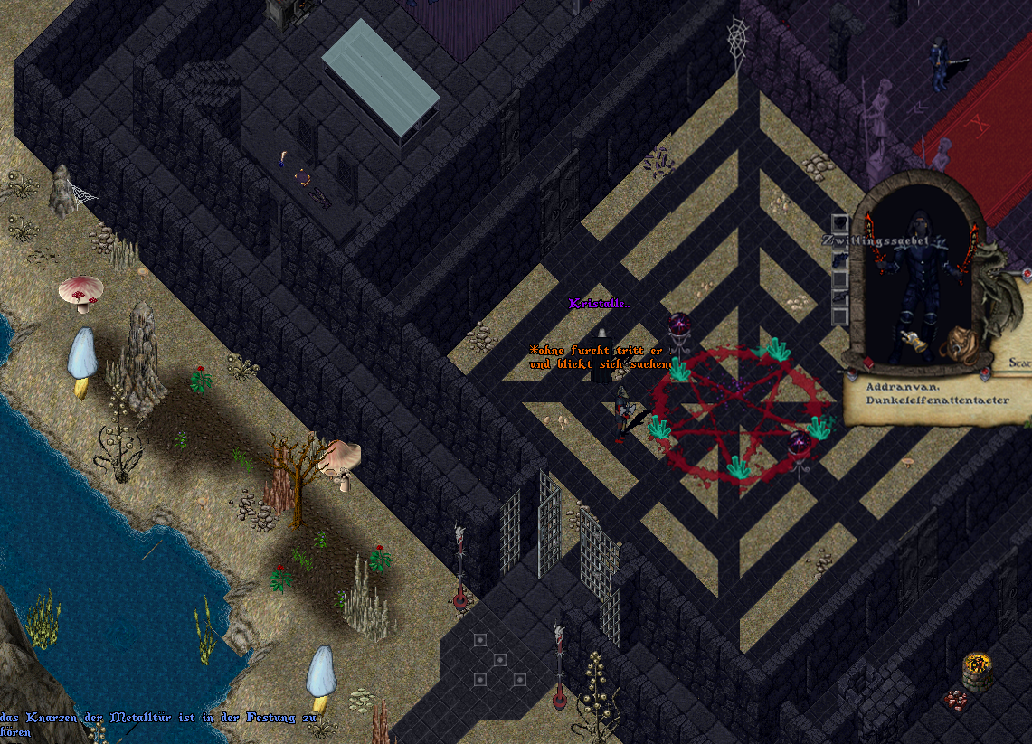 Gespenstisch ruhig lag der große netzartige Innenhof vor ihr. In der Mitte war das blutige Pentagramm gezeichnet, dass die Priesterinnen gemeinsam auf ihrer Expedition gezeichnet hatten. Ein schwaches pulsierendes Leuchten markierte den entstehenden Zugang zur dämonische Existenzebene.