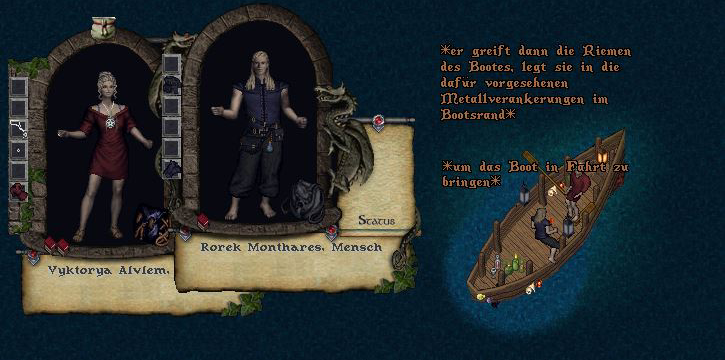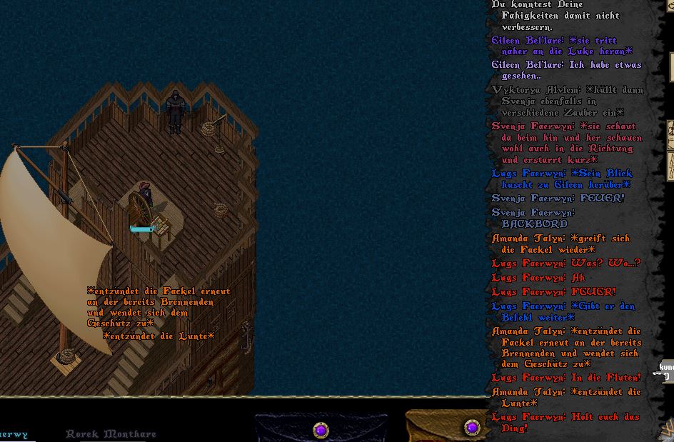 Es war Roreks Idee ein Ersatzsegel wie eine Decke von außen an den Rumpf zu spannen… verrückt. Aber irgendwie leuchtete es ein. Mit Seilen hatten sie das Segel durch das Wasser um den Rumpf gezogen und konnten das Leck leidlich stopfen. Und dann ging es endlich hinaus auf den See. Die Crew belud die Kanonen und Rorek machte sich für seinen Tauchgang bereit.