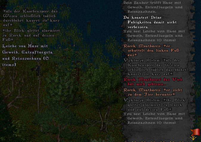 Die Sonne tiefer und tiefer und die Nacht legte sich schließlich vollständig über die Lande, als sie sich auf den Heimweg machten. Sie hatten sich entschieden den Weg zu Fuß zurückzulegen. Ein Spaziergang entlang am Ufer des Binnenmeeres. Hatten sie erwartet hier ebenfalls nichts zu finden, so wurden sie eines Besseren belehrt. Nach nur wenigen Schritten ertönte ein leises Knacken vor ihnen im Gebüsch. Kurz hatten sie innegehalten, allerdings hatten sie sich dabei nichts gedacht und setzten ihren Weg fort. Vermutlich war dies nur ein Eichhörnchen oder eine Maus gewesen. Das jedoch im nächsten Moment ein kleiner schwarzer Schatten auf Rorek zuschoss, das kam doch etwas überraschend. „Achtung!“, hörte er Vyktoryas Ruf und im nächsten Moment spürte er auch schon den Schmerz im Bein. Das Biest, … was es auch war … hatte ihn gebissen? Sein Blick schnellte herum und seine Augen erfassten das Tier. Einen Wimpernschlag hielt er inne um in sich aufzusaugen, was er sah. Ein Hase. Ein Hase, … mit einem Geweih, Reißzähnen und Entenflügeln. Irritiert betrachtete er diese seltsame Kreatur und sah kurz zu Vyktorya hinüber, die ebenso verwirrt zu der Kreatur sah. „Also haben sie doch Recht.“, murmelte sie leise und sah irritiert zu Rorek. Dann flog sein Blick zurück zu dem Tier und er konnte gerade noch rechtzeitig das andere Bein wegziehen, welches dieses Mal offenbar Ziel des Angriffs werden sollte. Kaum, dass der Hase ihn verfehlt hatte flog er herum und sprach auch schon die Worte der macht. „Corp Por“. Der Energiestrang knisterte zwischen seinen Händen und im nächsten Moment hüllte eine Explosion den Hasen ein. Doch der Hase … oder was auch immer es war, lebte noch. Wie konnte das sein? Der Hase setzte erneut zum Angriff an, doch bevor er ihn erreichen konnte wurde er von Knochen eingehüllt, die Sternförmig in den Leib des Hasen eindrangen und ihn aufspießten. Das gab dem Tier den Rest und es brach vor seinen Füßen zusammen.