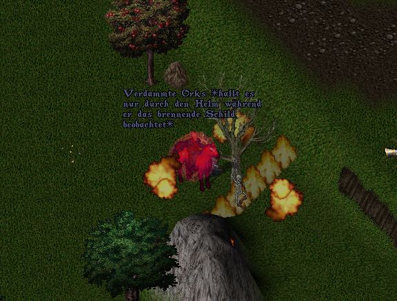 Doch zuvor mussten diese schändlichen überaus hässlichen Schmiererein der Orken beseitigt werden. So fokussierte der Elementarist die Kräfte des Elementes "Feuer" und ließ Flammendewände mit den Worten "In flam Grav" um den Baum an jenem er das Schild erblickte aufgehen. Es war ihm ein Genuss zu beobachten wie die Flammen den Stamm des Baumes hinauf krochen und das Schild der Orken erreichte......