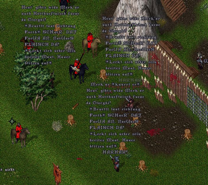 FERDAMMTE FUNZLA, AMENA ZIKT’IR WHUK’“ wütend schrie der Ork seine Magier-Beleidigungen „Wenn Groukh erwischän diza Bunthmagia, dann Groukh werdän quätschän Augä fon Koppa.“ mit seiner gepanzerten Faust schlug er gegen das verbannte Schild, die Reste gaben der Wucht des Schlages nach und zerfielen zu Staub.