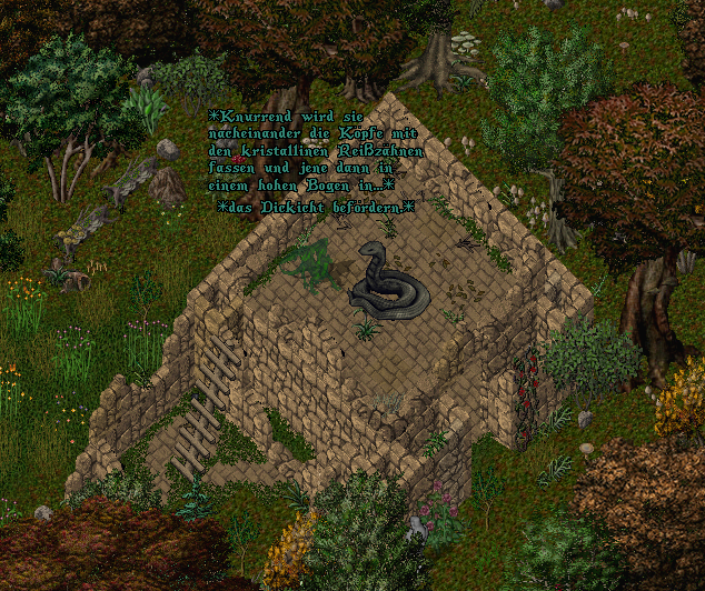 Köpfe, offenbar auf brutale Art von ihren untoten Leibern getrennt, stapelten sich zu 'Füßen' der Lindwurmstatue. Ein heißer Schwall breitete sich in den Gliedern aus, deren Ursprung ein zorniges Brodeln in ihrem Kern war. Die filigranen Flügel ausgebreitet, schnappte sie sich einen Kopf nach dem anderen, um ihn schließlich in einen hohen Bogen in das Dickicht der Umgebung zu befördern. Mit einem dumpfen Geräusch und begleitet von einem entsprechenden Rascheln kamen sie dort in der Dunkelheit auf - doch das war nicht alles. Ein süßlich, muffender Geruch wurde vom nächsten Windhauch mitgetragen und ließ das intensiv grüne Augenpaar des Kristalldrachens zur Seite schnellen.