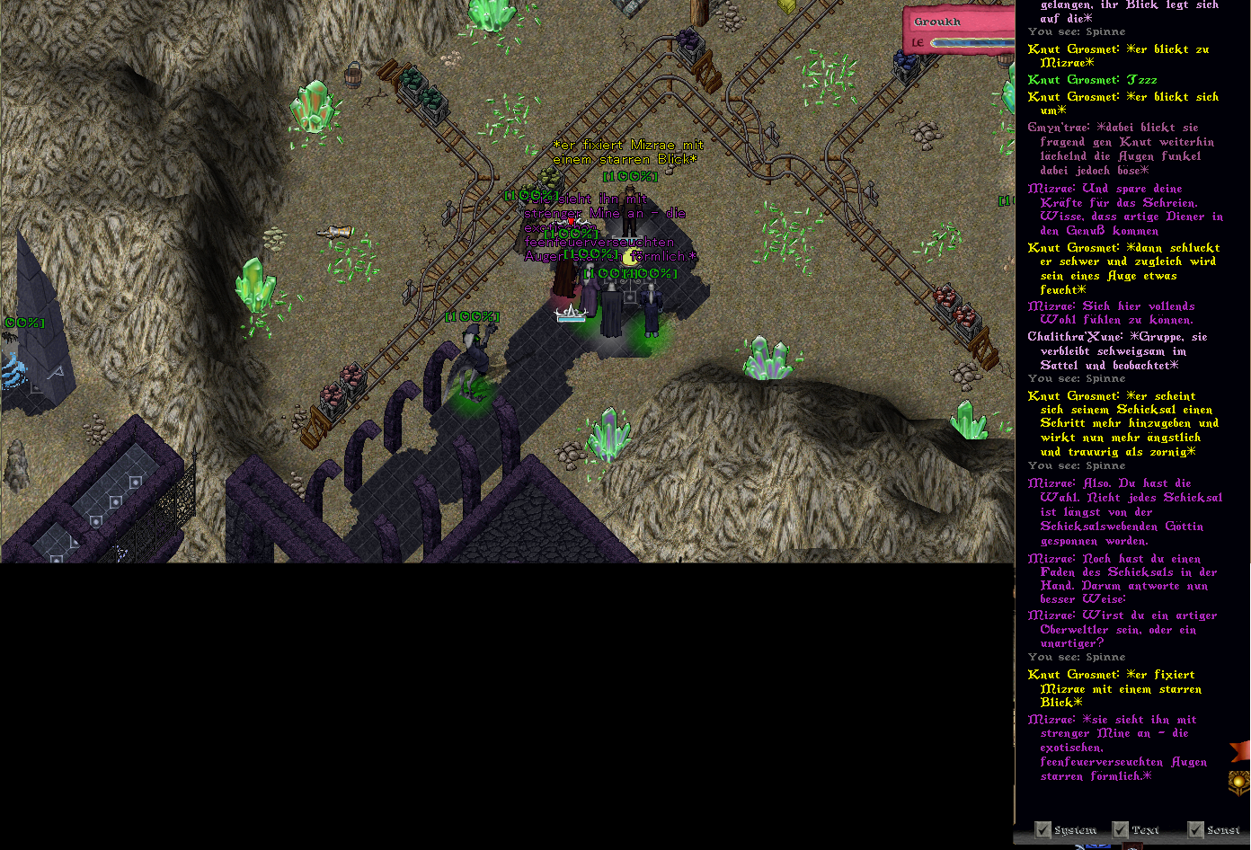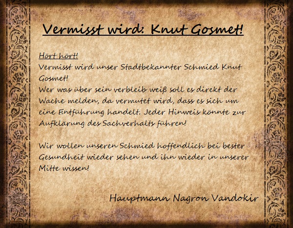 Erste brauchbare Gedanken schossen bald darauf durch seinen Kopf. Er stand in der Ostmine, wollte bald den Feierabend mit einem Bier genießen. Dann eine fremde Person. Sie sollte sich als Dunkelelfe herausstellen, zu der noch weitere Drows und Orks hinzustießen. Chaotisch flogen die Ereignisse des vorangegangenen Tages an seinem inneren Auge vorbei und seine Stimmung verfinsterte sich. Gigantische Pranken eines hässlichen Monstrums. Nicht ein Mal, nicht zwei Mal, unzählige Male prasselten die heftigen Schläge auf ihn ein. Dann wieder Dunkelheit. So schien er wohl hier her gekommen zu sein. Er solle ein guter Oberweltler sein, wurde ihm gesagt. Daran erinnerte er sich nun. Voller Panik und Angst war er und so fiel es ihm schwer sich an Details und alles Gesagte vom gestrigen Tage zu entsinnen.