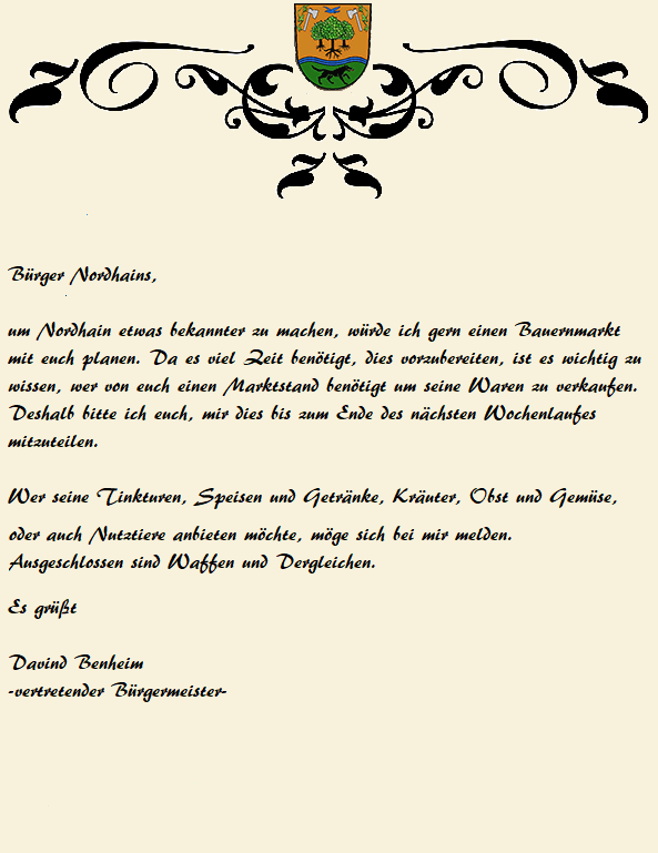Nachdem nun einige Zeit der Gedanke eines Bauernmarktes in seinem Kopf herumgeschwirrt ist und er mit einige auch schon darüber gesprochen hatte, nahm er nun alles Nötige zur Hand und verfasste einen Aushang, den er dann auch anschließend in der Bank anbrachte.