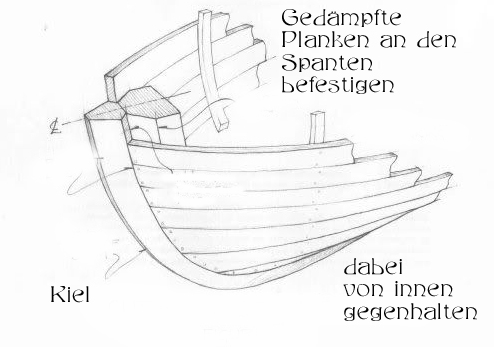 - gedämpfte Planken von außen an die Spanten ansetzen