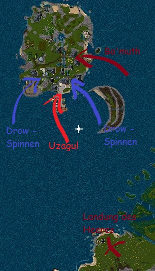 Der Plan schien aufzugehen und die Angreifer konzentrierten sich für eine Weile lang zur Gänze auf Uzaguls Angriff über den Hafen. Die Spinnen sorgten zusätzlich für Chaos und und ließen Ba'muth hinreichend Zeit mit seinen Truppen ungehindert zu flankieren, anzulanden und die Insel nach jenem Schatz abzusuchen, für welchen er die Legion hier her befehligt hatte: den Sternensplitter.