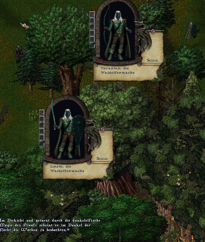 Ahnungslose Wachen marschierten am Waldesrand und ahnten nicht, dass sie genau studiert und beobachtet wurden. Alles schien wie sonst zu sein...Xun'aun war ein Teil dieser Nacht geworden und glitt förmlich über den Waldesrand wie ein ungesehener Geist... Er wollte auch mehr über die Waldelfen wissen, denn wie hieß es so schön? "Kenne deinen Feind oder deine Opfer gut um Erfolg zu haben." So ging er tiefer zwischen die dichten Bäume hindurch...und studierte das Verhalten der Waldelfen genauer....er vertraute seinem Piwawfi zwar, aber ging kein Risiko ein und somit achtete er da drauf, sich den Wachen nicht zu sehr zu nahen, wer weiß welche Sinne diese dennoch hätten....er wollte Erfolg haben und somit ging er vorsichtig näher...