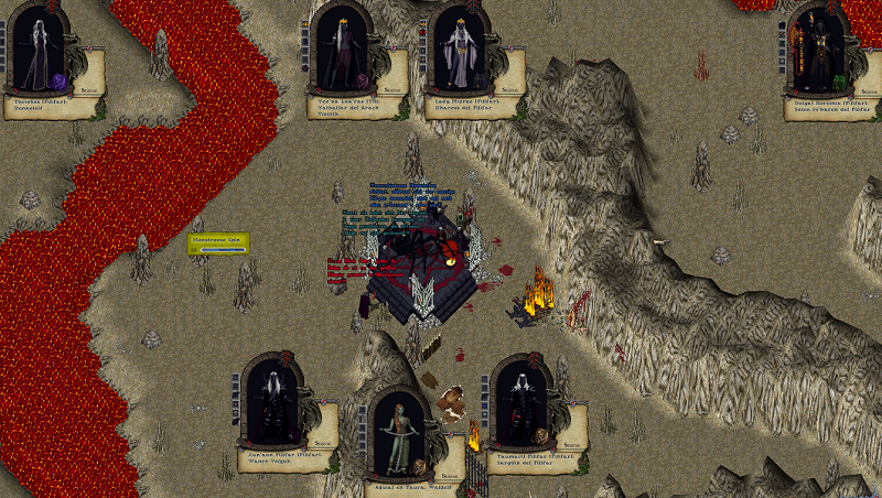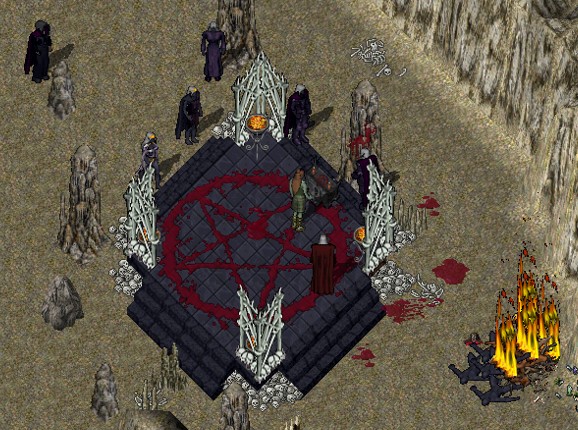 Dort angekommen forderte sie Xun’aun und Taumaril auf die Waldelfe am Altar zu befestigen. Beide folgten diesem Befehl ohne zu zögern. Alle Mitgereisten verteilten sich um den Platz. Belszerion teilte ihnen mit, mit einer gestikulierenden Geste auf einer brennenden Haufen Dunkelelfen der Lloth, das ihr heutiges Unterfangen nicht Risiko frei ist und auch sie sich bei den kleinsten Fehlern, diesen anschließen könnten.