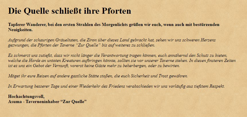 Aufgrund der schaurigen Gräueltaten, die Ziron über dieses Land gebracht hat, sehen wir uns schweren Herzens gezwungen, die Pforten der Taverne “Zur Quelle” bis auf weiteres zu schließen.