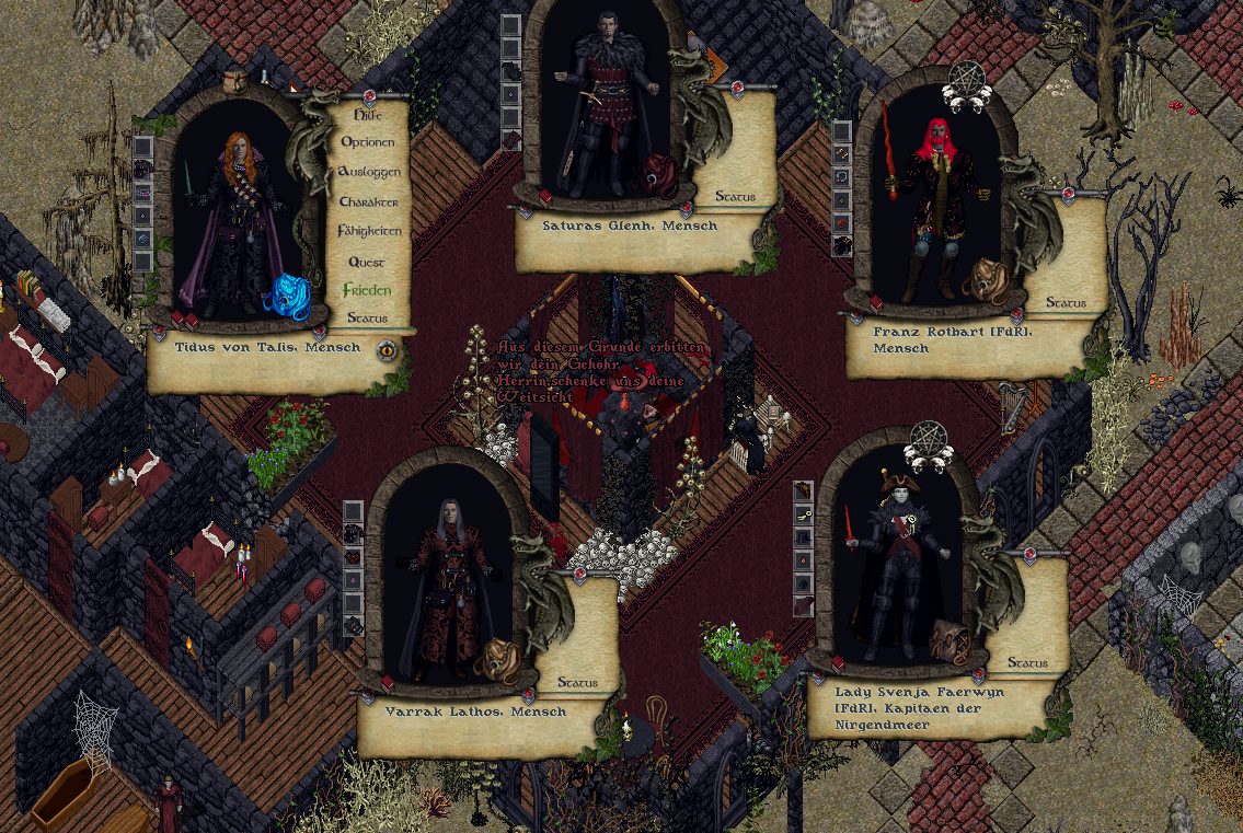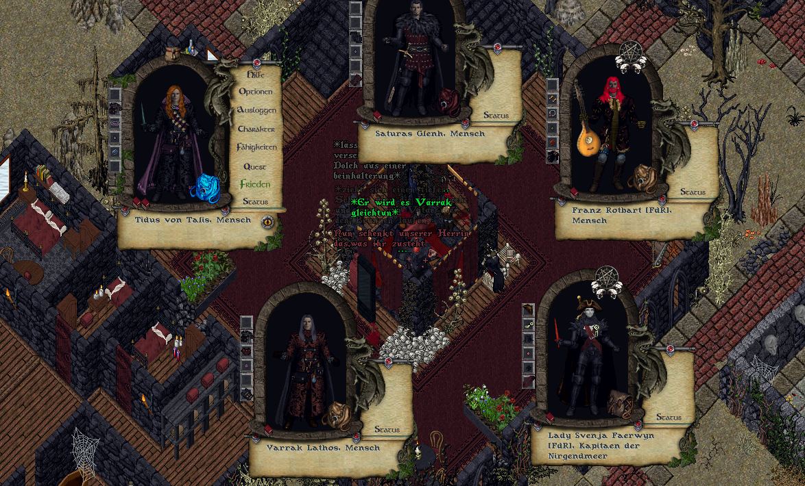 Die übrige Zeit verbrachten sie damit sich in der sterblichen Welt anzubiedern, Kriegsspiele zu spielen oder…bei dem Gedanken keimte Übelkeit in ihm auf…in der heiligsten Kapelle des Herrn… mit priesterlichem Segen… in Anwesenheit von Paladinen, Priestern und sonstigen Lichtexistenzen… zu heiraten und zu feiern. Jüngst wurde dem Lichtreich sogar die Treue geschworen…auch aus Angst heraus getrieben, wie es wohl scheint, denn durch den jüngsten Besuch von Soryia und seiner abtrünnigen Schwester Sorsha vor wenigen Stunden haben sich interessante Informationen ergeben. Soryia hatte sehr energisch versucht ihre Mentoren zu verteidigen…fast schon so als hätte sie sich angegriffen gefühlt. Kein Wunder, dass sie in Sorsha´s Nähe war…sie schienen die gleiche impulsive Emotionalität in sich zu tragen, von der sie sich steuern ließen. Ein unangenehmer Makel verbliebener Sterblichkeit eines früheren Lebens. Oder auch schlichtweg Schwäche. Glücklicherweise änderte dies nichts an den Informationen selbst, wenngleich es auch ein Armutszeugnis in sich darstellte, dass eine Schülerin ihre beiden Mentoren und Ältesten in Schutz nehmen musste ohne, dass sie angegriffen wurden. Rorek und Vyktoria versteckten sich also vor dem Nekromanten, der das Oberreich bedrohte und das, obwohl sie ihn schon einmal besiegt hatten, wie Soryia sagte. Es war geradezu amüsant, dass sie dafür sogar in den Schoß der Silberburger flüchteten und dennoch die Kühnheit besaßen seinen Erzeuger und ihn selbst als Mitglieder abzuweisen wo sie scheinbar doch so sehr geschützt werden mussten. Und doch wollten sie herrschen…