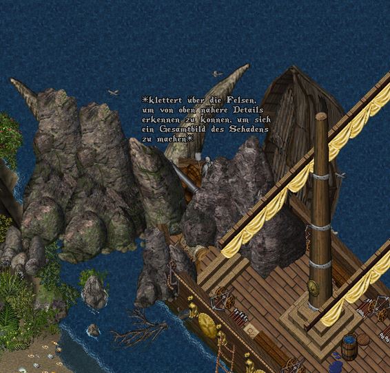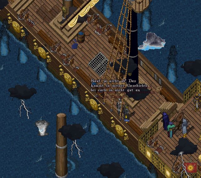 Doch etwas fehlte. Niemand übernahm das Kommando. Niriel schien unter Deck verhindert zu sein und es war keine Zeit mehr, nach ihr zu suchen, denn der Sturm war heran. Als kleinen Vorgeschmack schwappte der erste Brecher über Deck.