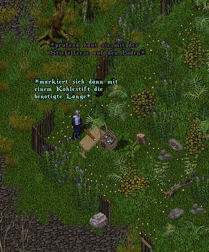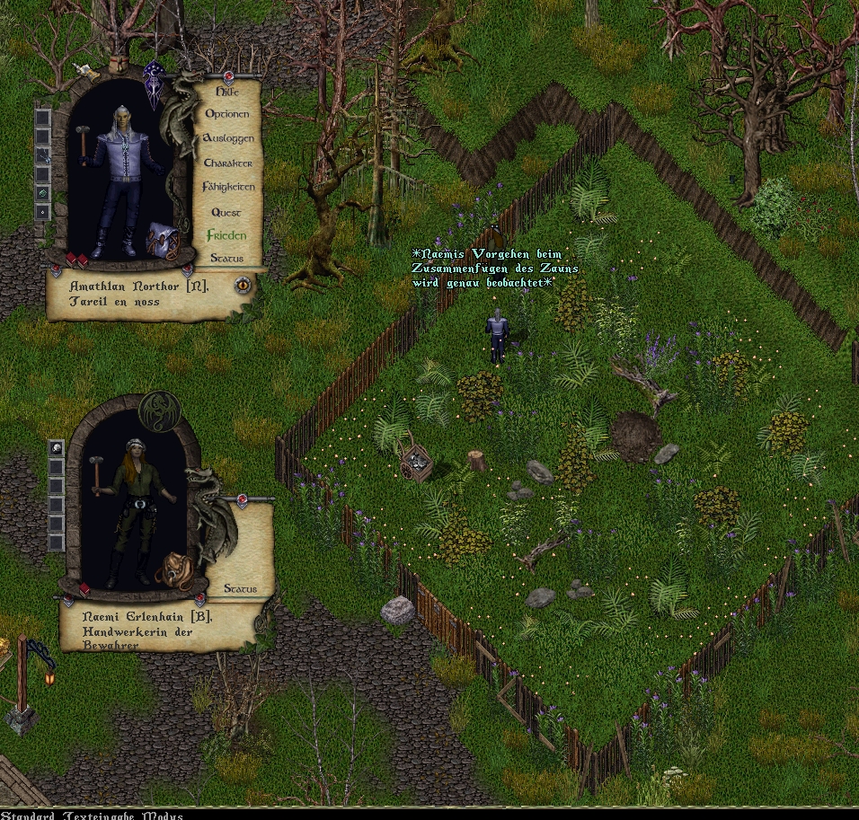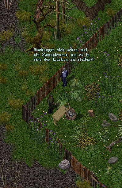 Sie würde darin beim Lesen informiert werden über die Fertigstellung des Tiergatters nebst Gattertor auf dem besichtigten Areal, durchgeführt von der Handwerkerin der Bewahrer Naemi Erlenhain und Tarcil Amathlan Northor. Für die fehlenden Zaunelemente sei Eichenholz verwendet worden, damit diese möglichst lange Bestand hätten.