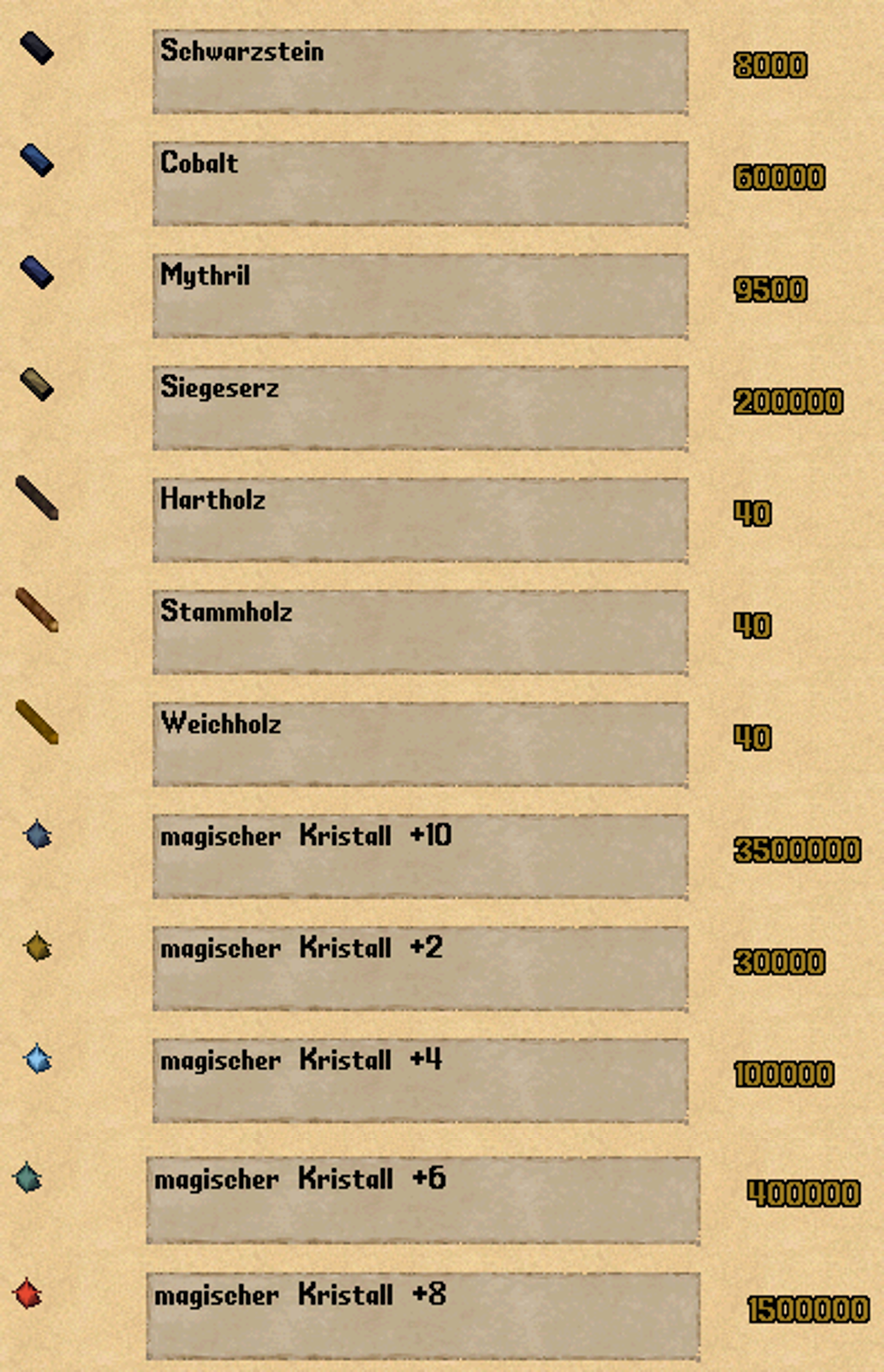 Es geht die Nachricht in dem Stadtkern Silberburgs umher, dass Ole und Ulla die Ankaufspreise für magische Kristalle der bereits geringsten Ordnung und für Mythrilbarren deutlich angezogen haben. Es ist so attraktiv wie nie magische Kristalle oder Mythril zu verkaufen.