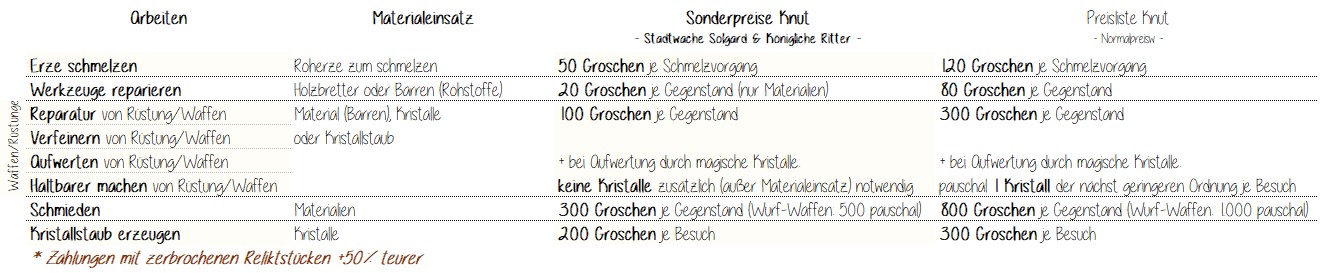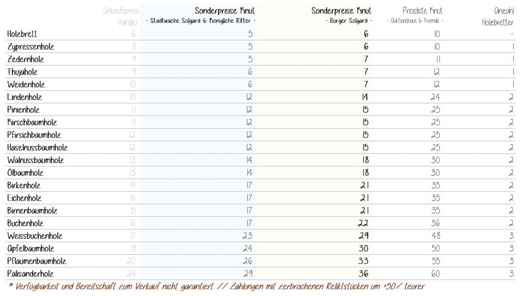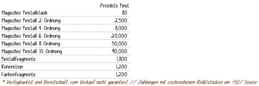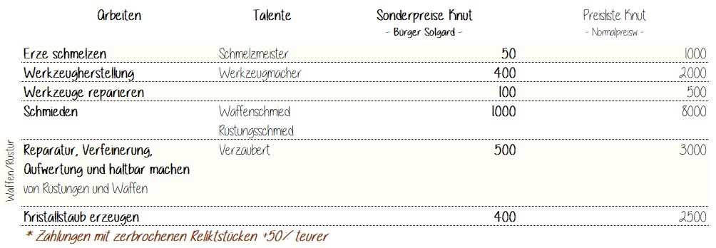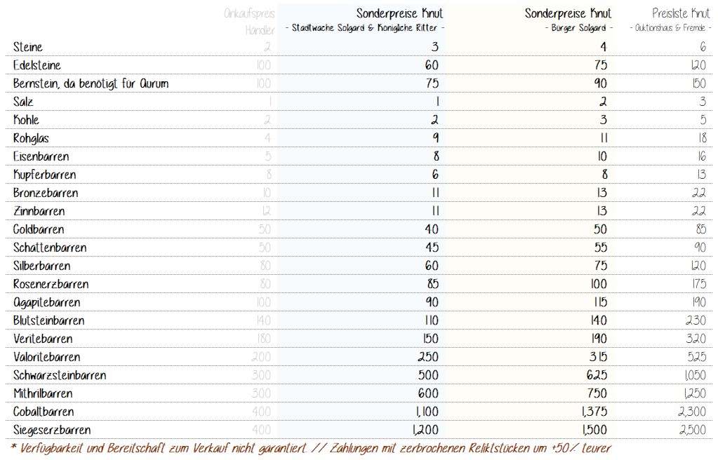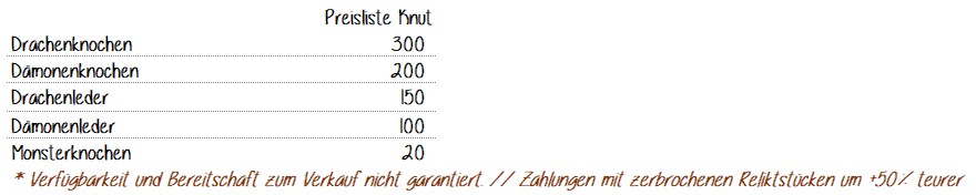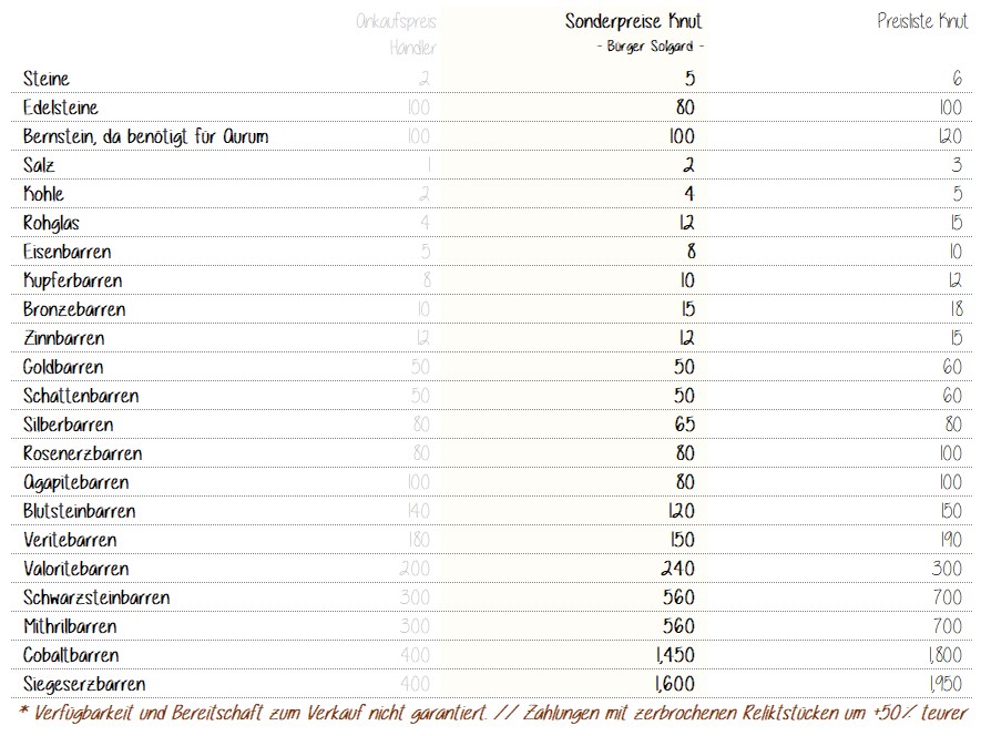 Auf erneuerte Preislisten für Knuts Arbeiten und Materialpreise wird hingewiesen. Bürger Solgards erhalten wie immer einen niedrigeren Preis. Knut handelt vor allem Erzbarren und Edelsteine aus dem Berg.