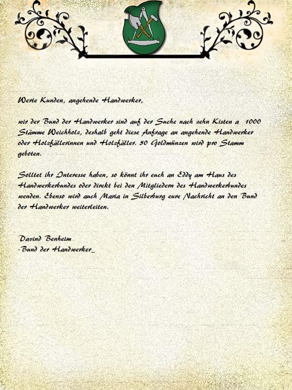 Herr Benheim lässt folgendes ausrichten. Gern fertigt der Bund der Handwerker eine Blutsteinrüstung für euch an, so kommt doch am Besten am Tag des Dienstes zum siebten Glockenschlag am Abend, es wird jemand anwesend sein, der sich die Maße notiert für unseren Schmied und alles weitere mit euch besprechen.