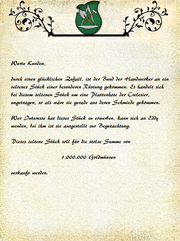 Herr Benheim lässt folgendes ausrichten. Gern fertigt der Bund der Handwerker eine Blutsteinrüstung für euch an, so kommt doch am Besten am Tag des Dienstes zum siebten Glockenschlag am Abend, es wird jemand anwesend sein, der sich die Maße notiert für unseren Schmied und alles weitere mit euch besprechen.