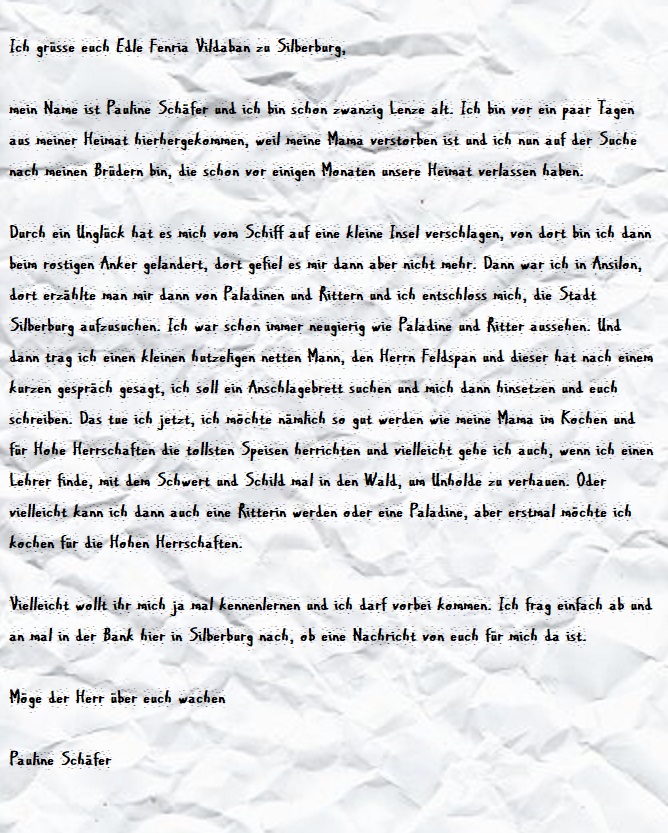 Auch nach Pauline wird der Bote mit dem Wappenrock der königlichen Ritterschaft dann suchen und mündlich mitteilen das die Truchsess für eine Audienz gerne bereit ist und sie nach freien Wünschen sich voran kündigen kann.