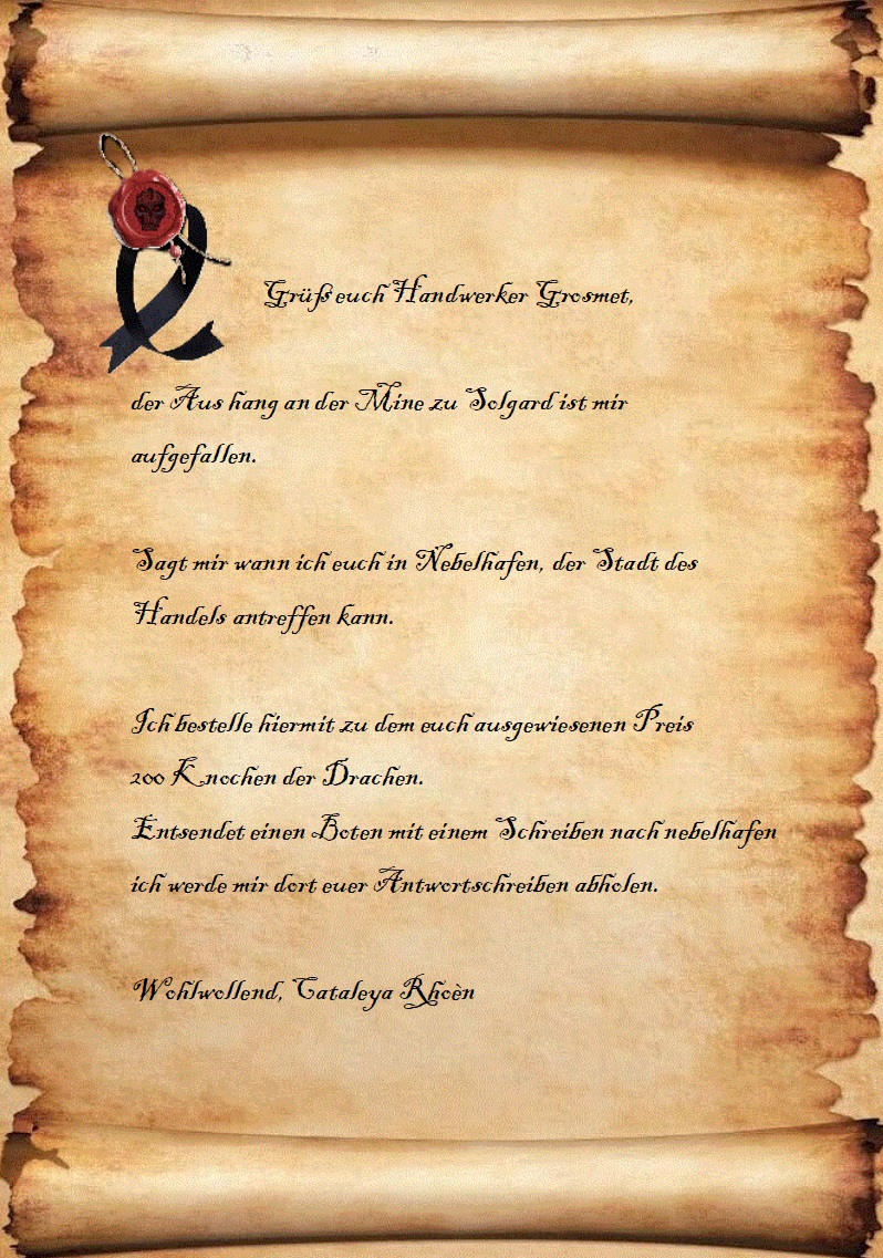 *Ein Bote wird an der Mine zu Solgard immer wieder auftauchen bis er letztlich ein gerolltes Pergament Knut höchst persönlich übergeben kann*