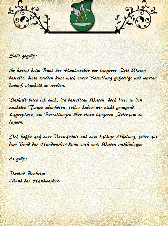 Beim einsortieren von bestellten Waren, fielen ihm wieder einige Bestellungen auf, die schon länger zur Abholung bereit standen. Nun wollte er die Gunst der Stunde nutzen und schrieb den Auftraggebern eine Nachricht, die er dann in der Bank in Nebelhafen bei Gerwin und Ina für sie hinterließ.