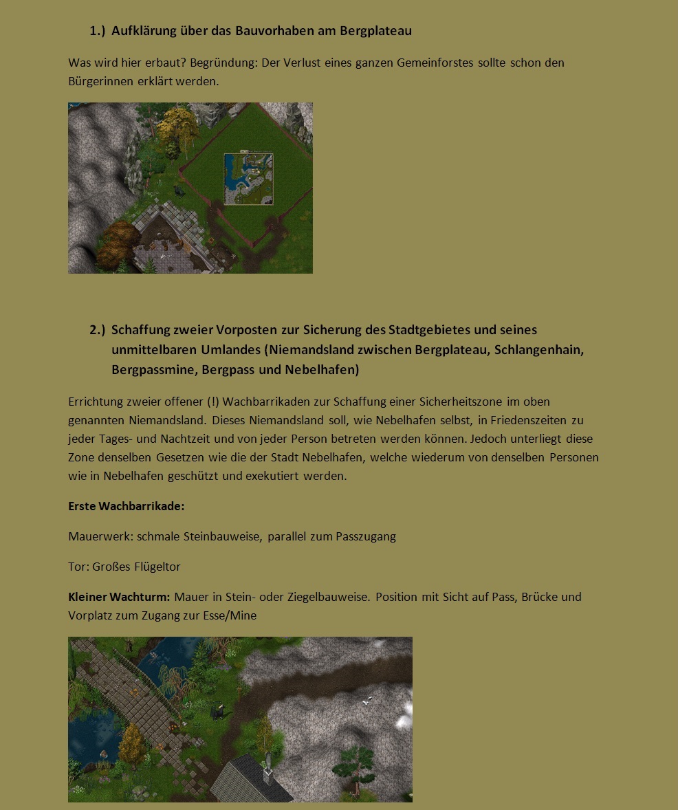 Des Weiteren wäre es schön, wenn man die noch ausstehenden Baumaßnahmen in Nebelhafen dem Ende zuführen könnte. Das Gerüst um den Bäcker steht beinah so lange da, wie wir hier in Nebelhafen sind, die Wege sind halb verwildert, man erhält kaum Ware, weil die Händler auch wenig Platz für ihr Angebot haben. Hier biete ich mich natürlich auch an zu helfen - und sicher nicht nur ich.