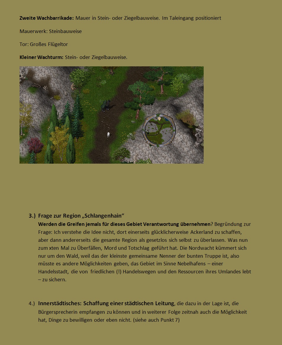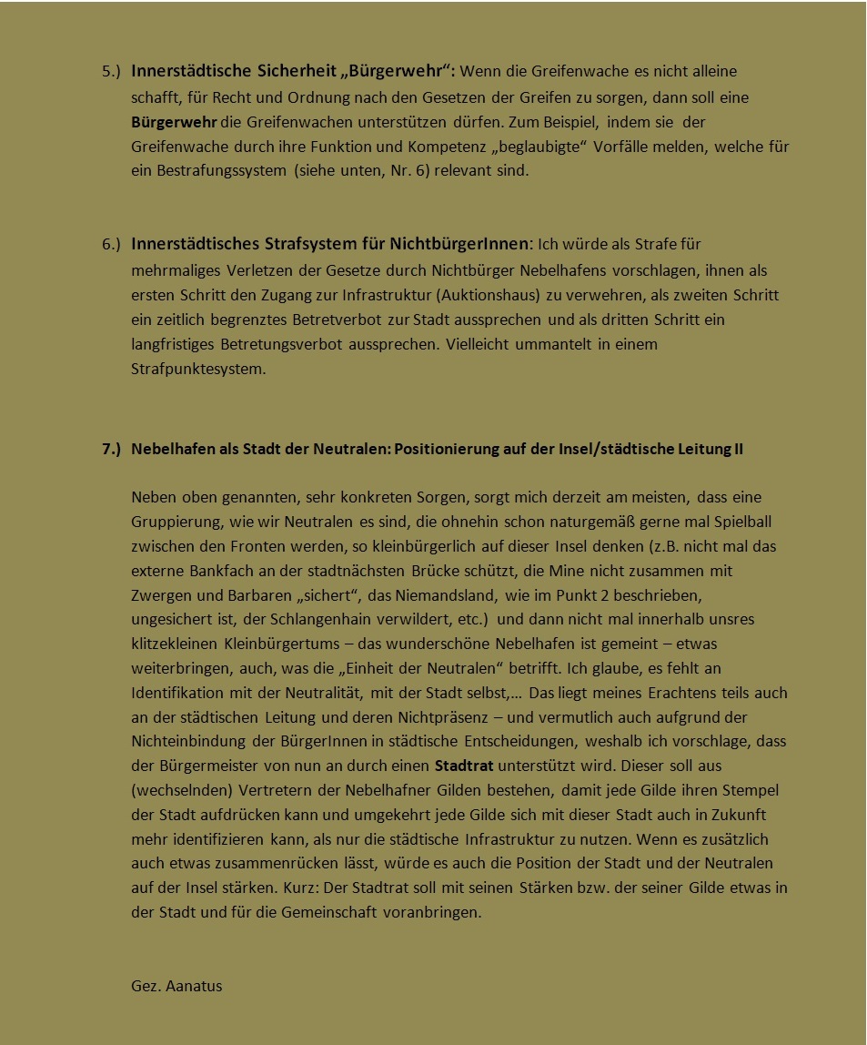 Ich werde diese Anliegen aufnehmen und mit den Greifen darüber sprechen ob diese mit den gemeinschaftlichen Zielen Nebelhafens vereinbar sind.