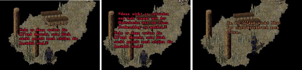 Sie versuchten die Minenwand für den Durchbruch zu durchbrechen, doch ohne Erfolg, stattdessen löste sich ein dicker Brocken von der Einsturzstelle und legte einen kleinen Spalt, aus dem dann der Geruch der Verwesung nocheinmal geballt die Mine überflutete. Nachdem man die ersten Stützbalken gesetzt hatte, legte man ein weiteres kleines Stück frei und stützte auch hier wieder ordentlich ab.