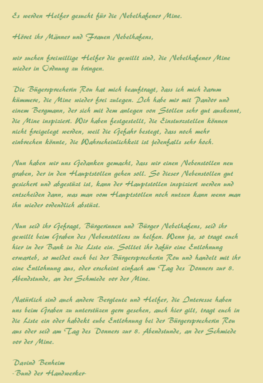 Er hatte sich noch mal ein Bild gemacht, von der Stelle wo der neue Durchbruch zum Hauptstollen gegraben werden soll. Der Bergmann hatte eine gute Stelle ausgesucht und vertraute da auch seinem Urteil. Nun galt es Helfer zu finden, deshalb machte er sich an die Arbeit und schrieb einen Aushanb, den er dann auch sogleich in der Bank ans Anschlagebrett hing. Essen, Getränke und Werkzeuge würden an der Mine zur Verfügung stehen.