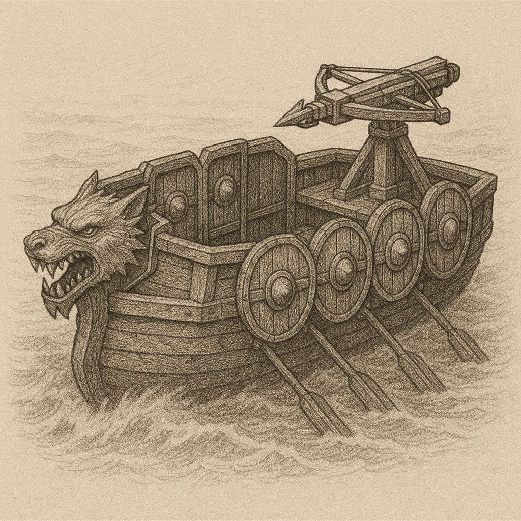 Wir begannen damit, das Grundgerüst zusammenzusetzen. Zlata führte uns durch die einzelnen Schritte. Wir brachten die Teile nach und nach herran, während Radesvald die Sicherungen und Splinte einhämmerte. Das rhythmische Klopfen des Hammers, das Knarzen des Holzes und das metallische Klicken der Bolzen erfüllten den Bollwerkshof wie eine ehrliche, handwerkliche Melodie.