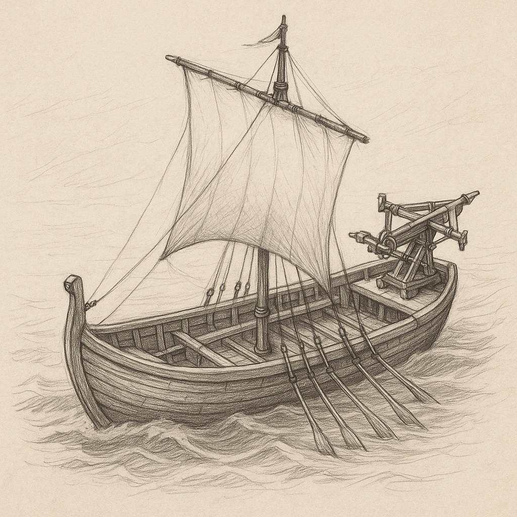 Dann war der Moment gekommen... Wir richteten die Balliste über die Bucht hinweg aus, prüften nochmals alle Verankerungen und Zlata gab das Zeichen. Ein dumpfer Schlag, ein scharfes Zischen und der Bolzen flog mit solcher Wucht davon, dass wir ihm kaum folgen konnten. Er zog eine klare, kraftvolle Bahn und verschwand schließlich weit jenseits des Wassers. Nach Schätzung lag die Reichweite zwischen achtizig und einhundert Schritt. Dies war an Kraft und Geschwindigkeit weit mehr, als wir erwartet hatten.