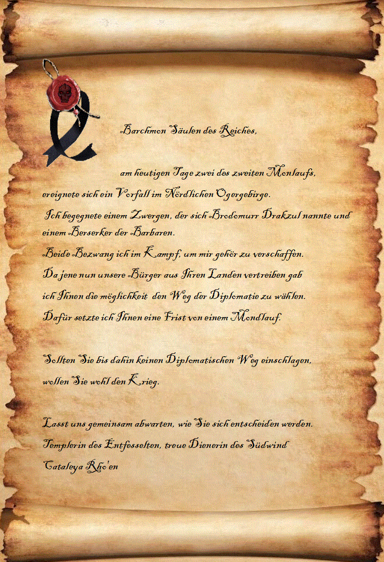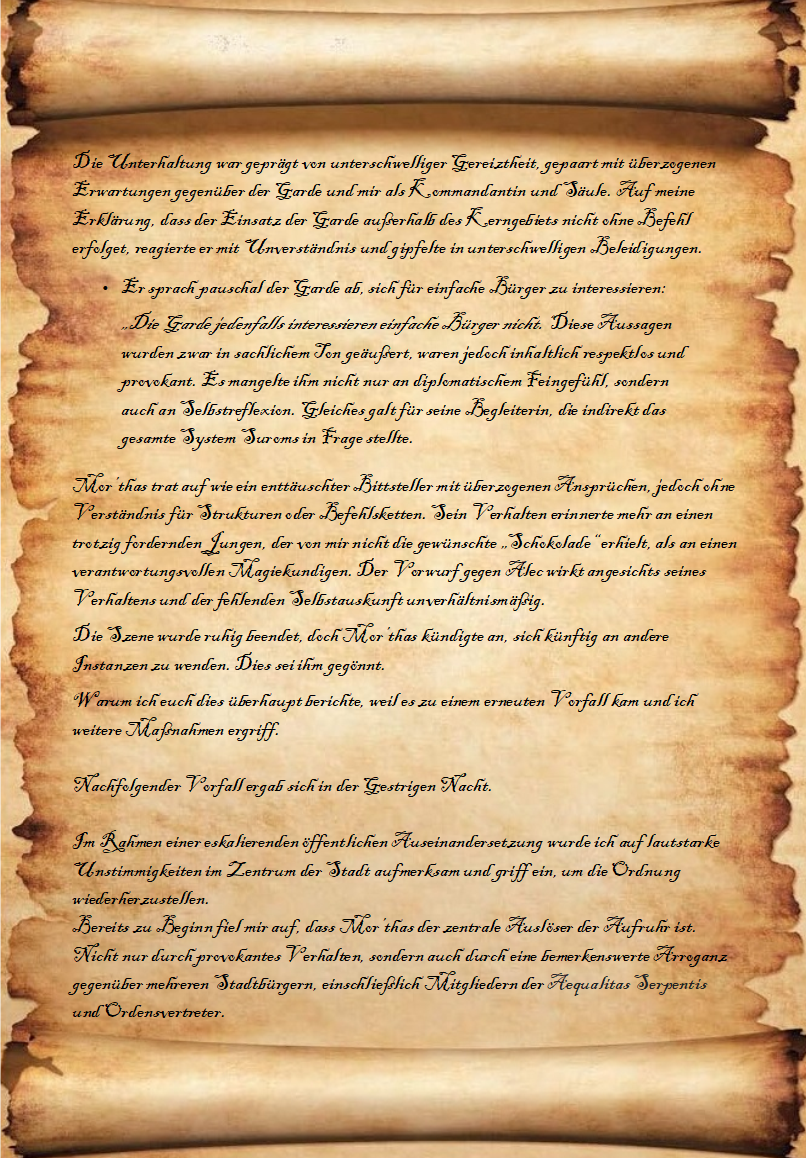 im Folgenden berichte ich über die Unterredung mit Mor’thas und seiner Begleitung in Bezug auf einen Vorfall in den Trollschluchten. Der Inhalt wurde sachlich entgegengenommen, doch das Auftreten und Verhalten des Magister erfordern eine kritische Einordnung.