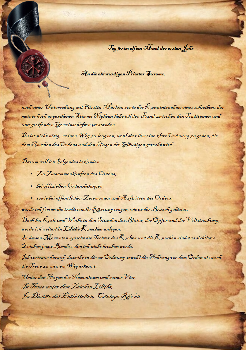 "Im Namen Cataleya bringe ich Schreiben an die ehrwürdigen Priester Suroms."