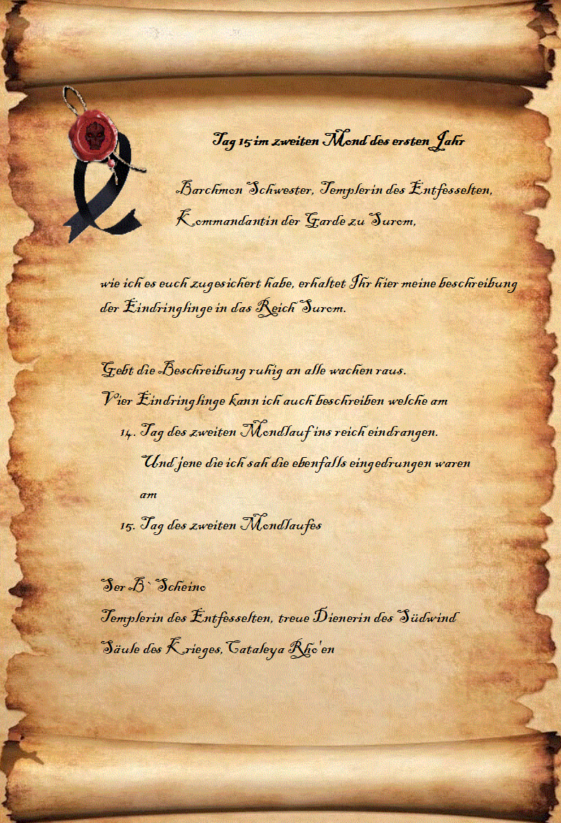 Die Meldung von Alejandra von Hagwalm landet in der Bericht Mappe der schwarzen Garde. Eine Abschrift der Meldung wird an die Säulen des Reichs weitergeleitet.