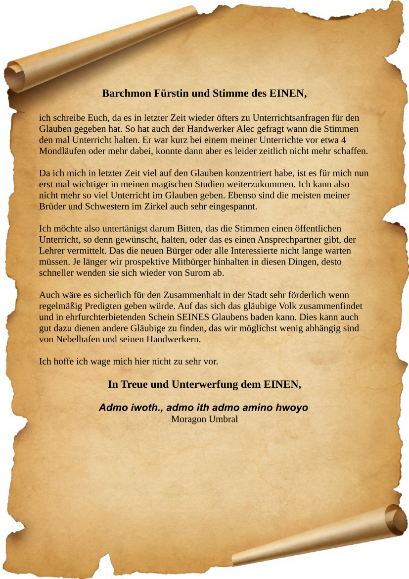 Wenn Marleen das nächste mal den Tempel betritt, so wir eine kleines bläulich durchsichtig schimmerndes Teufelchen Ihr folgenden Brief überreichen: