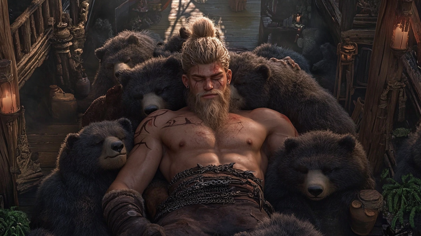 Die Bären begannen zu mampfen, zu schlingen und zu schmatzen, wie es der Welt in ihren schlimmsten Albträumen nie eingefallen wäre. Sie fraßen nicht nur den Inhalt der Schüsseln, sondern bald schienen sie auch das Inventar des Langhauses zu prüfen. Was nicht festgeschraubt war, verschwand in ihrem Rachen: Holzbänke, Stuhlbeine, ein halber Baldachin. Während Bjornar mit rot glühenden Wangen versuchte mitzuhalten, tobte im Saal ein Schmaus, der mit jedem Schluck und jedem Bissen die Wände zum Wanken brachte. Am Ende war der Raum verwüstet wie nach einem Fest, bei dem keiner mehr wusste, wer eingeladen war.