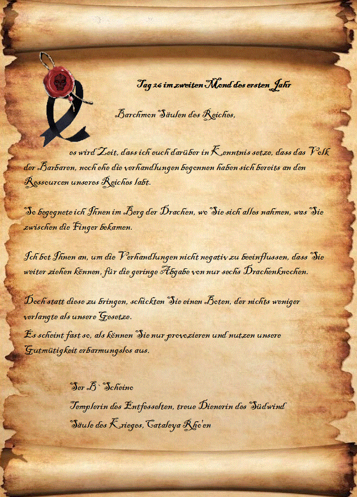 Das Thing begann mit einem kraftvollen Ruf von Rashka. "Wir sind hier, um einen Aufstand gegen die Tyrannei von Surom zu planen! Diese geforderten Zölle auf unsere Jagdwaren sind nicht nur ungerecht, sondern auch ein Versuch, unsere Völker zu spalten." Murmeln der Zustimmung hallten durch die Versammlung.
