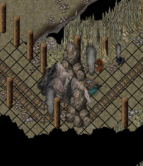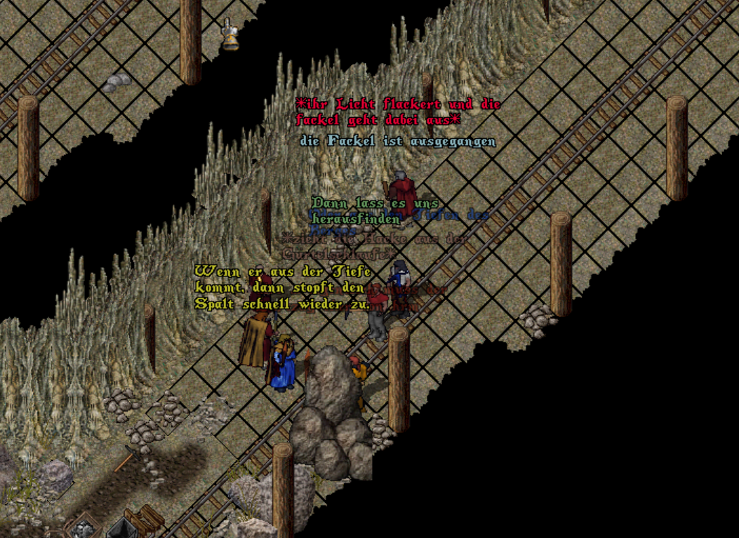 Während ein Teil der Gruppe bei der Spalte verweilte, näherten sich Zond und Damire dem Hauptzugang zur Mine – dem aus Nebelhafen. Schon beim Näherkommen war klar: Der Zugang war verschüttet. Geröll türmte sich auf, Pfeiler waren geknickt.