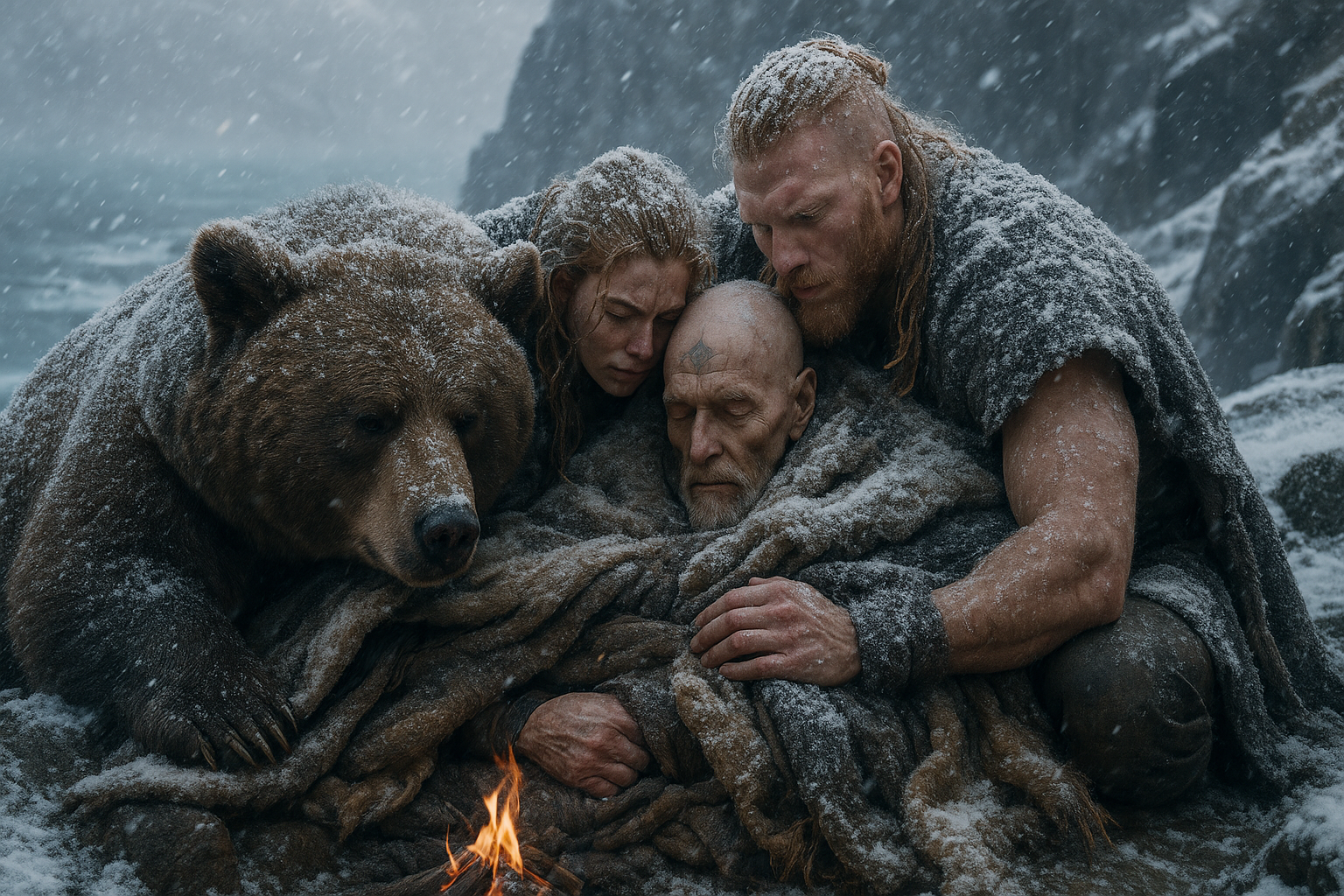Ynge und er wickelten den dürren Schamanen in ihre Pelze. Reichte das aus? Hoffnungsvoll brüllte Bjornar sein bestes Bärenbrüllen in das Tal hinab und da kam der beste Pelz herbei. Der hing nämlich warm an einem lebendigen Bären: Waelbjarn, Bjornars Bärenbruder, war seinem Ruf bis hinauf auf die Klippen gefolgt. Eng aneinandergeschmiegt, schützten sich die drei gegenseitig und hielten den reglosen Schamanen mit ihren Körpern warm.