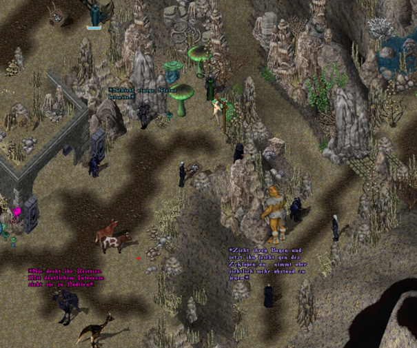 Es dauerte nicht lange, bis Shel’Dezar den gewaltigen Zyklopen mit der Kette im Schlepptau in die Höhle führte. Die bedien anderen sicherten den Transport mit Speer und Bogen ab.