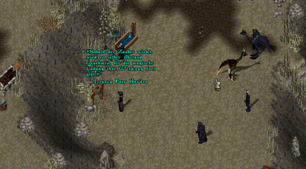 Den Stab an die magische Mauer lehnen und das Zauberbuch zur Hand nehmen. Er beschaut die Stelle an der Wand genau - die Hände wählen einige Kräuter aus. Er schließt die Augen, als würde er einen Moment all seine Konzentration sammeln, um einen optimalen Zugriff zu erlangen. Mit dem Heben der Arme scheint er das Wirken des Zaubers beginnen zu wollen - die Augen huschen nun hin und her. Fast in einem Singsang erklingen langsam die Worte der Macht "Izznarg Faer Har'dro". Sobald der Zauber wirkt, wird er selber Abstand einnehmen, bis die magische Ladung ihre Wirkung frei gibt.
